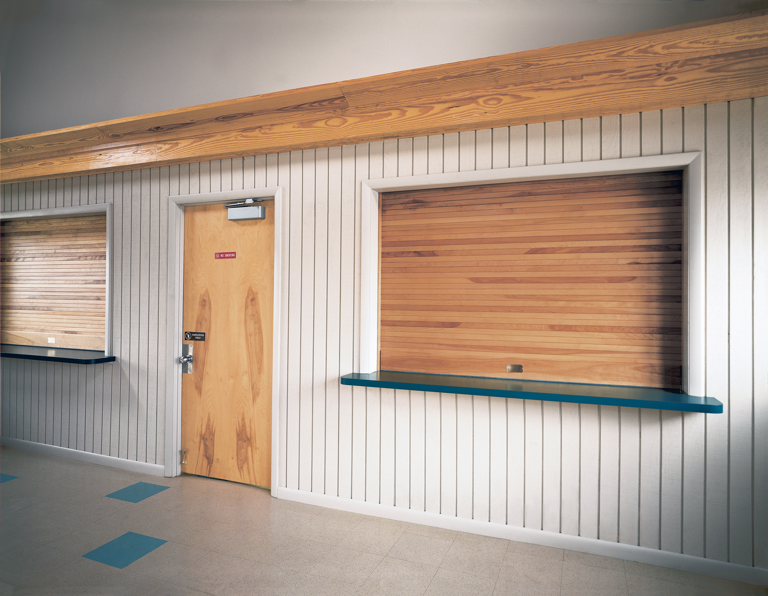The comprehensive system of counter doors encompasses three basic types: metal curtain, wood curtain, and integral frame and sill. Fire-rated counter shutters are also available and labeled with a 3-hour Class A rating for masonry applications. Rolling counter doors provide a multitude of attractive solutions for smaller openings to 20′ wide and 9′ high.