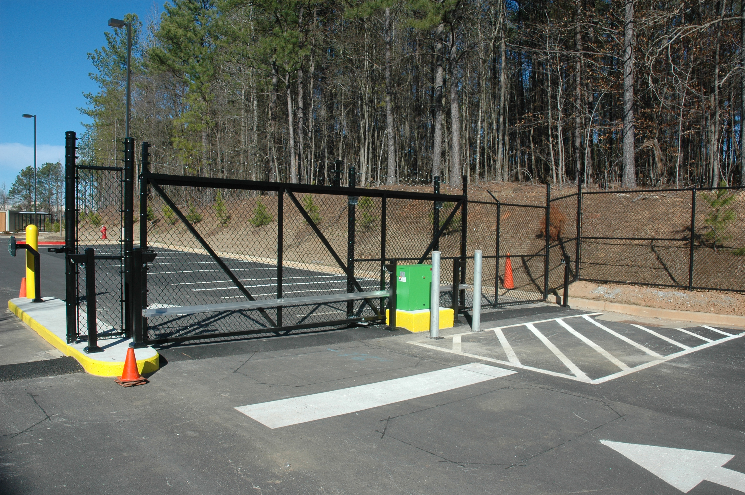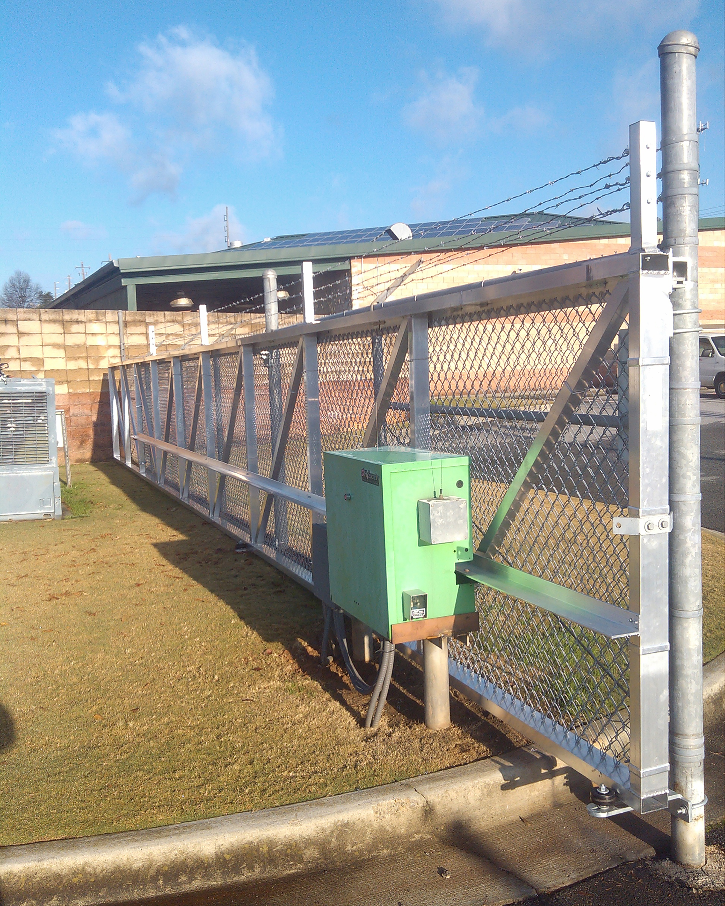 The sliding gate can be used in applications where swing or other types of gates may not be feasible. Designed to operate in a straight line, it can be used with a variety of gate operators such as hydraulic slide drive along a rail system or a chain driven electro-mechanical operator. The most widely used type of slide gate is a cantilever gate. It removes the need for tracking along the length of the opening of the gate and is affixed at one end. It uses a series of cantilever rollers to counterbalance the gate as it runs in a straight line suspended over the roadway. Cantilever gates are ideal for uneven pavement or where obstructions such as ice and snow are present. The cantilever gate also makes an excellent choice when designing a property perimeter fence and controlled access security system.